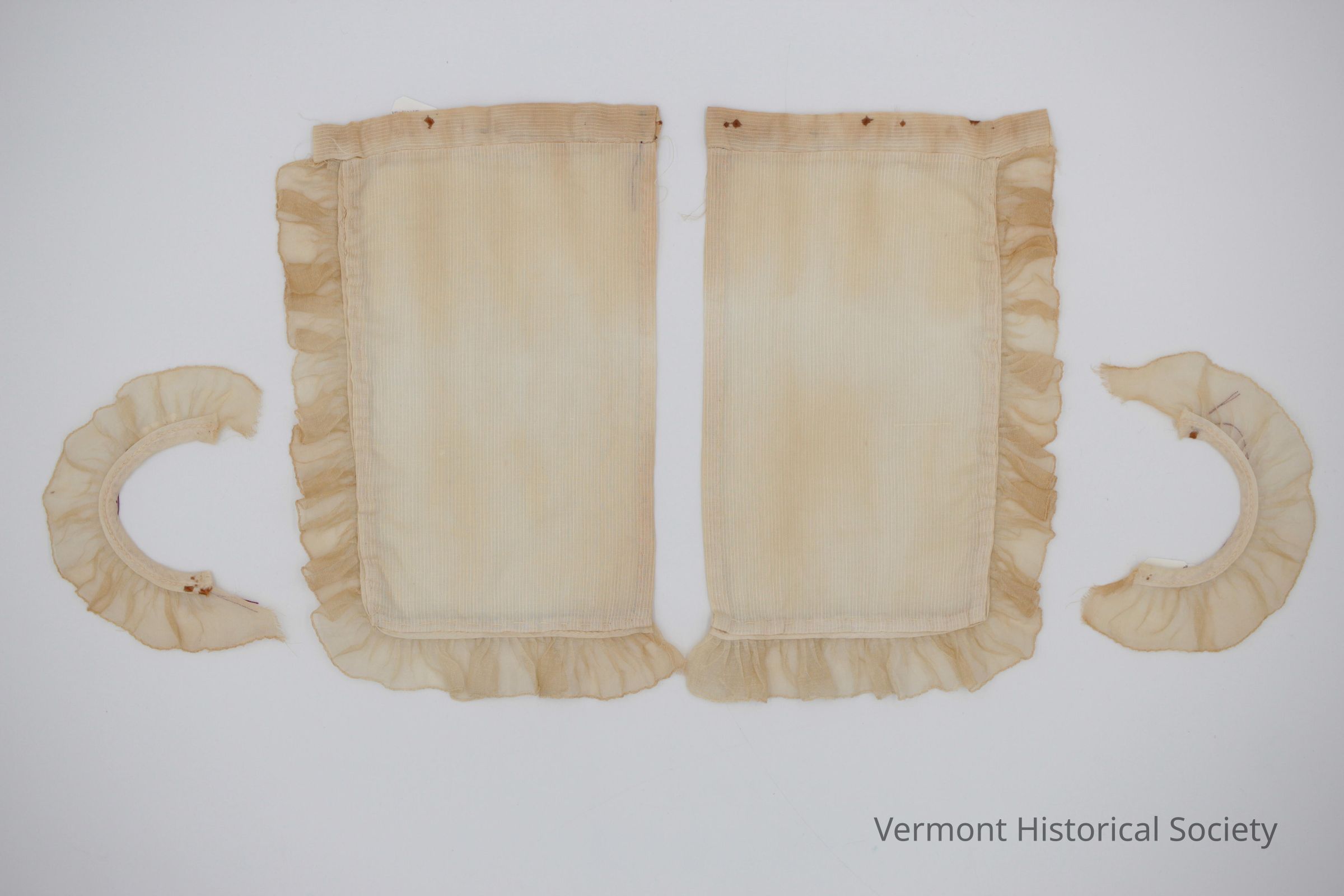 Miniature curtains sized for a dollhouse. The curtains consist of two panels and two tiebacks, each made of white dimity and edged with gathered sheer fabric.Context