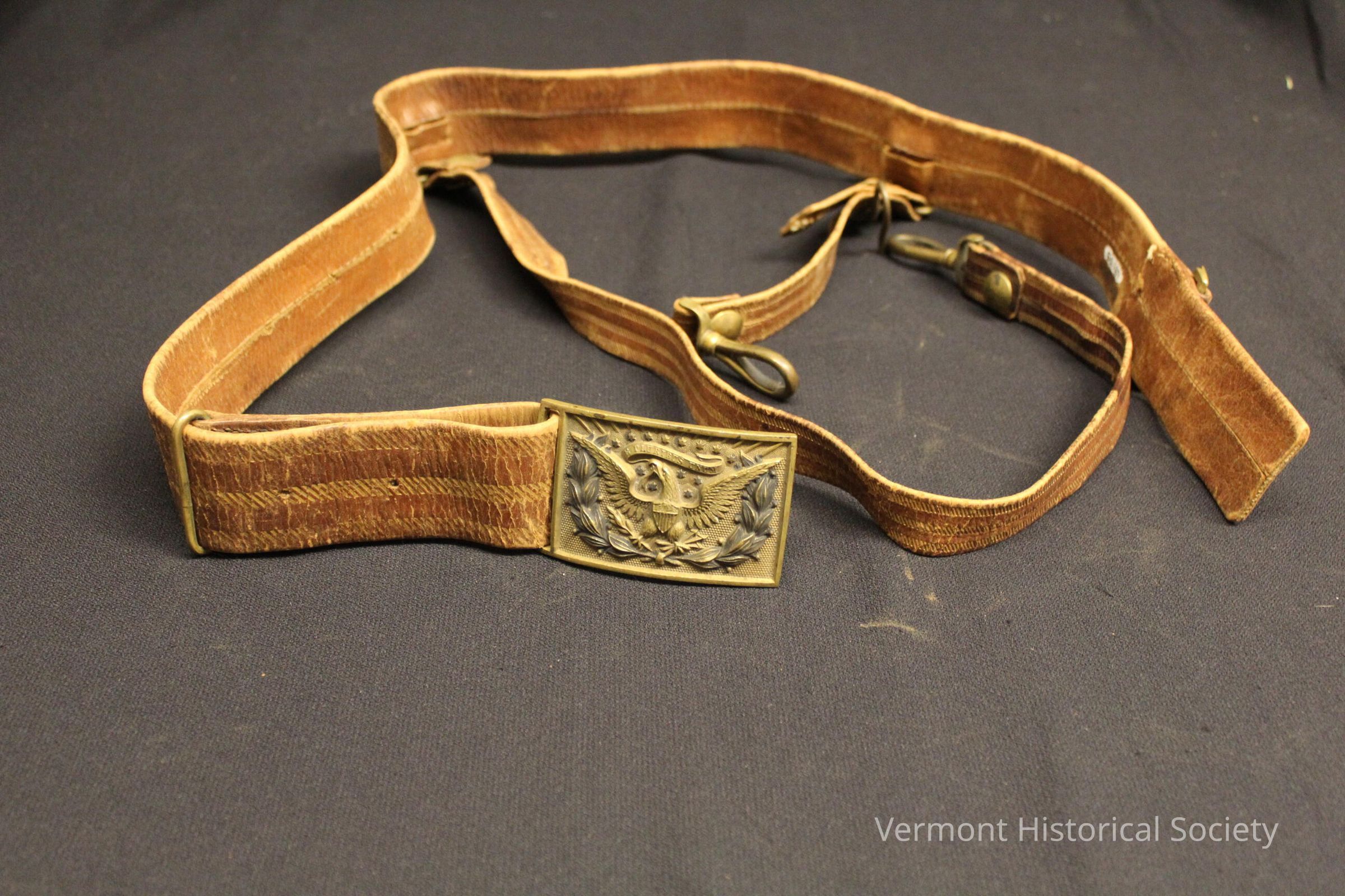 Leather sword belt with brass buckle. The belt has a shoulder strap, and both are decorated with gold paint in horizontal bands. The buckle has an eagle with a banner that reads "E Pluribus Unum".