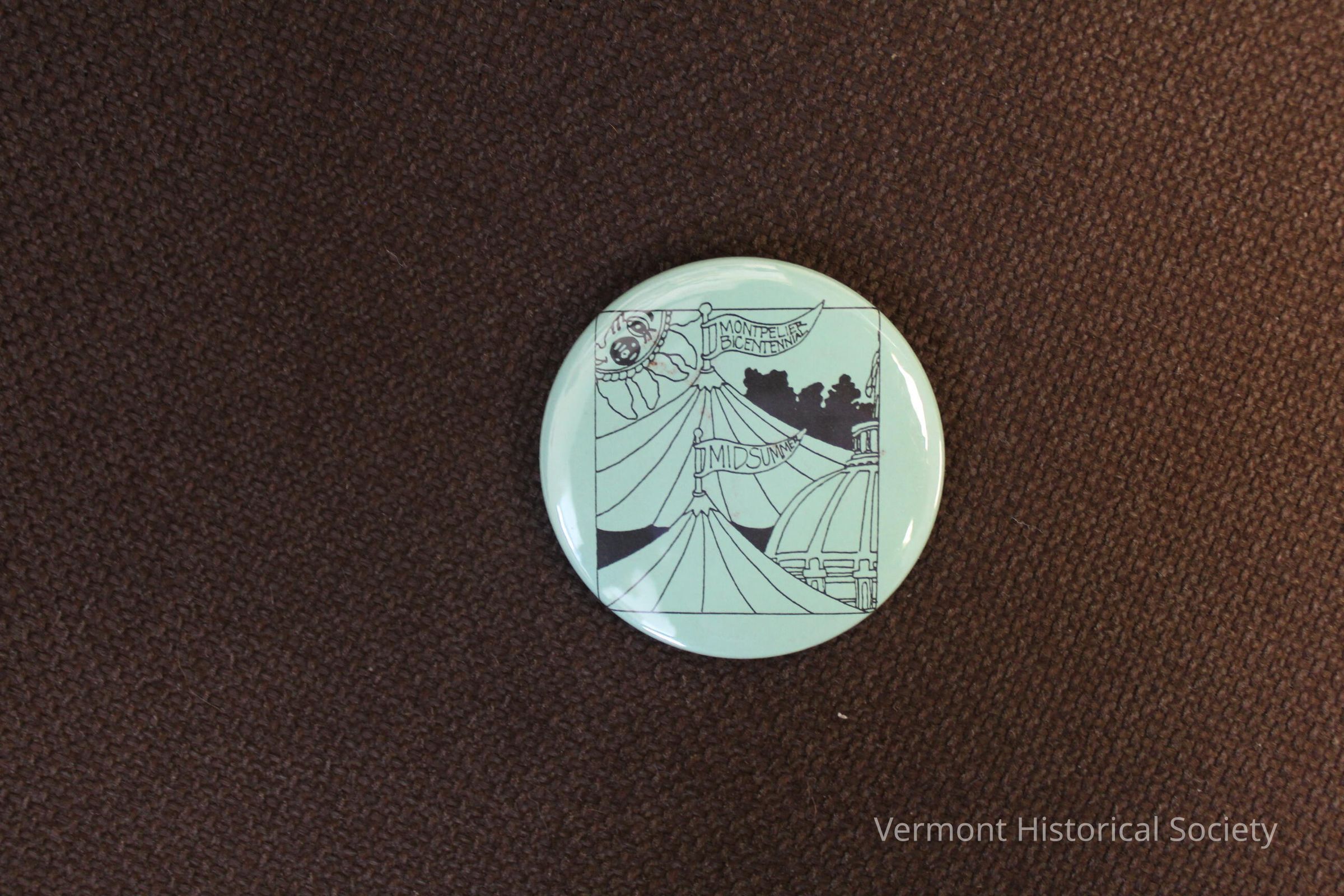 Round white metal button printed in black with an illustration of the peaks of circus tents and the dome of the Vermont State House. Two pennants fly from the peaks of the tents saying "MONTPELIER BICENTENNIAL" and "MIDSUMMER". A personified sun is at the upper left corner.Context