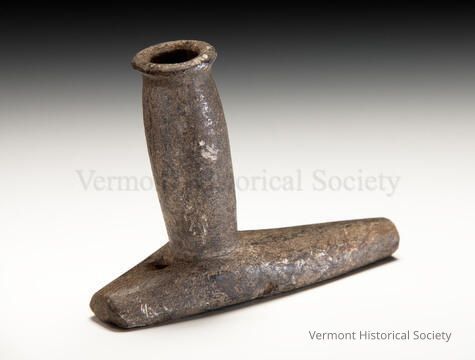 Smoking pipe made of soapstone. The pipe consists of an upright hollow tube with a slightly flaring mouth set into a nearly perpendicular hollow triangle that is open on one side. The whole is carved from a single piece of soapstone.