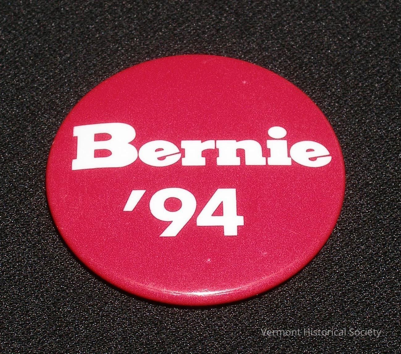 "Bernie '94" pin; red background with white lettering. On the edge is "Sanders for Congress" and the address of his Burlington headquarters.