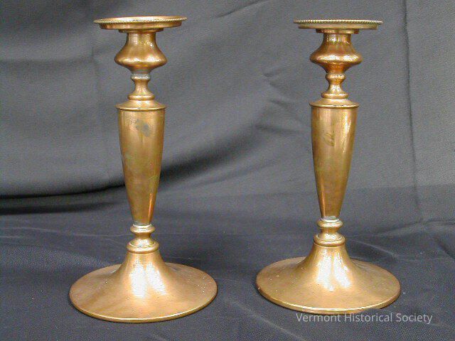 Pair of bronze candlesticks with round bases and vase-shaped shafts. The lip of the upper holder is stepped, reminiscent of a platter.