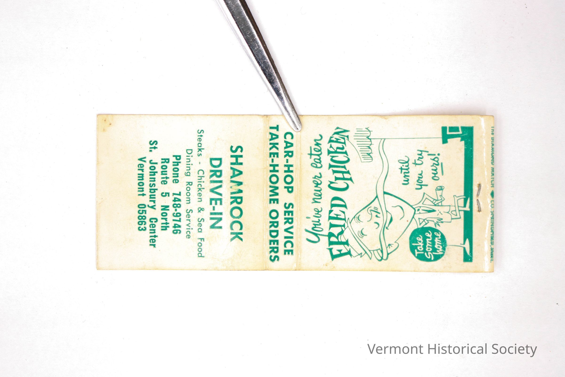 White cardboard bifold matchbook. The front flap is printed with the inscription, "SHAMROCK DRIVE-IN steaks - Chicken & Sea Food Dining Room Service Phone 748-9746 Route 5 North St. Johnsbury Center Vermont 05863".