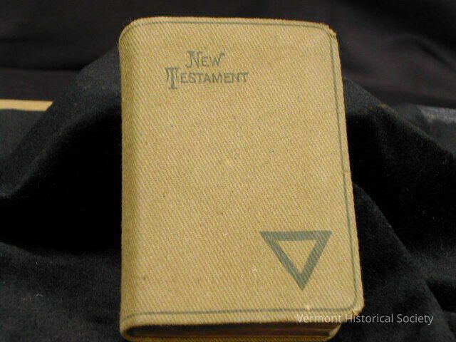 Cloth-bound New Testament bible. The book is covered with khaki twill-woven cotton printed in black with the words, "New Testament" and an outline of a triangle.Context