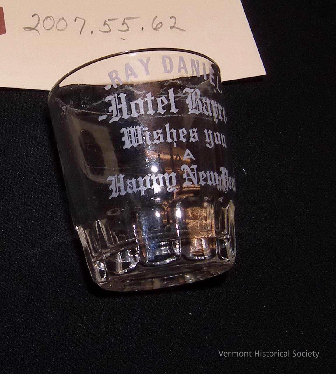 Clear glass shot glass etched with the inscription, "RAY DANIEL Hotel Barre Wishes you A Happy New Year" in gothic script.