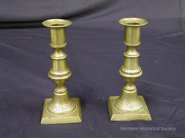 Pair of brass candlesticks with small square bases. The shafts are bell-shaped at the bottom and has a protruding central molding.