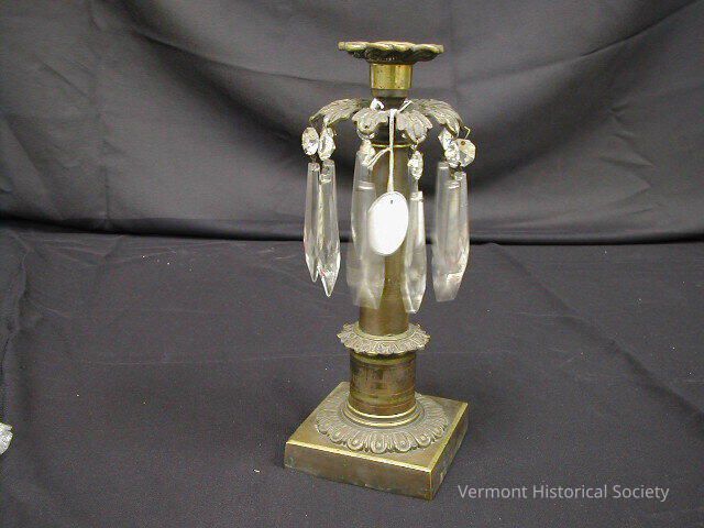 Brass candlestick with heavy, square base, and a leaf-shaped brass bobeche with nine crystal drops.