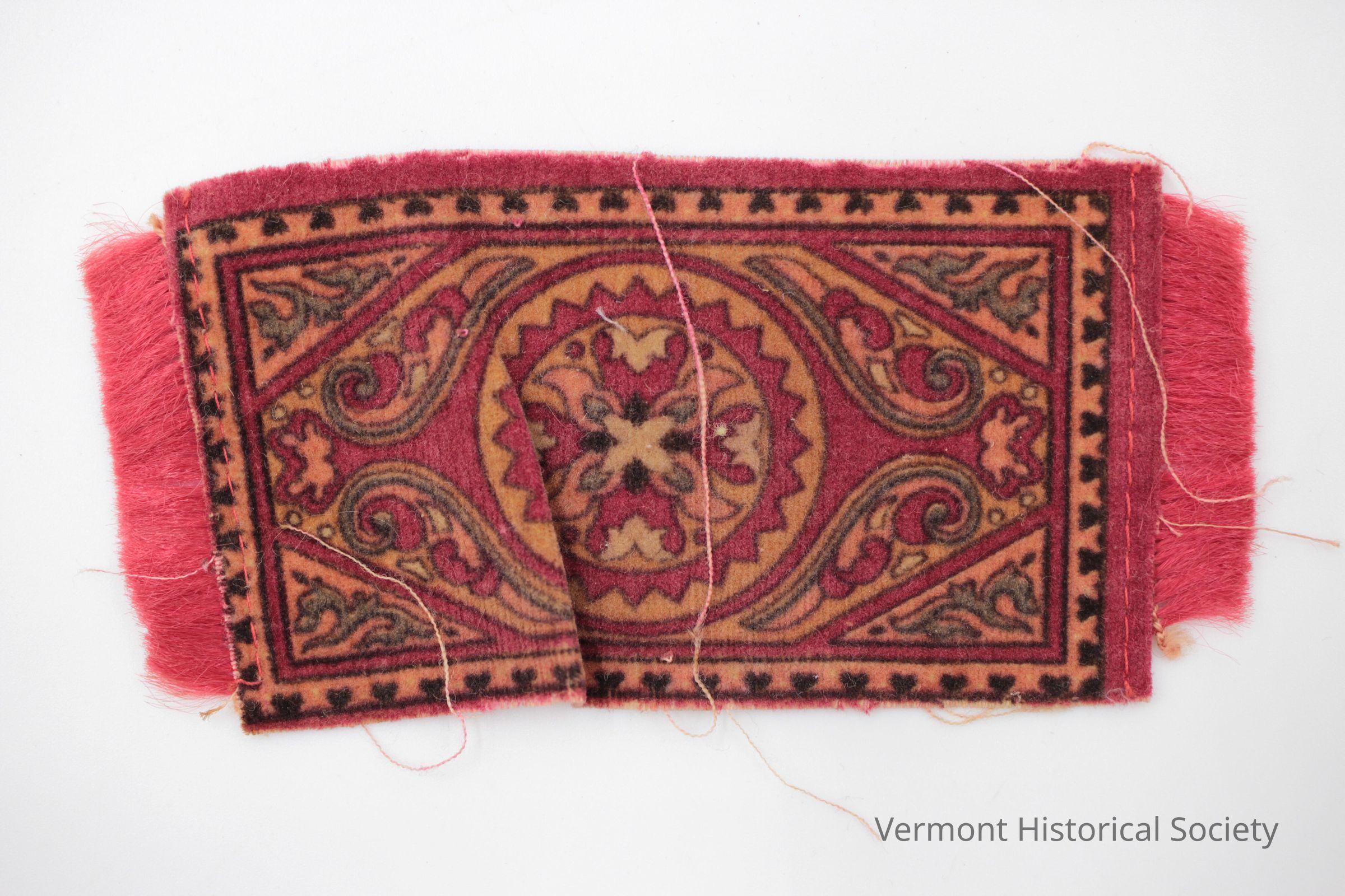 Miniature rug sized for a dollhouse. The rug is printed with an eastern-inspired design in pink, orange, green, and yellow with a central medallion. There is pink fringe stitched to each short edge of the rug.Context