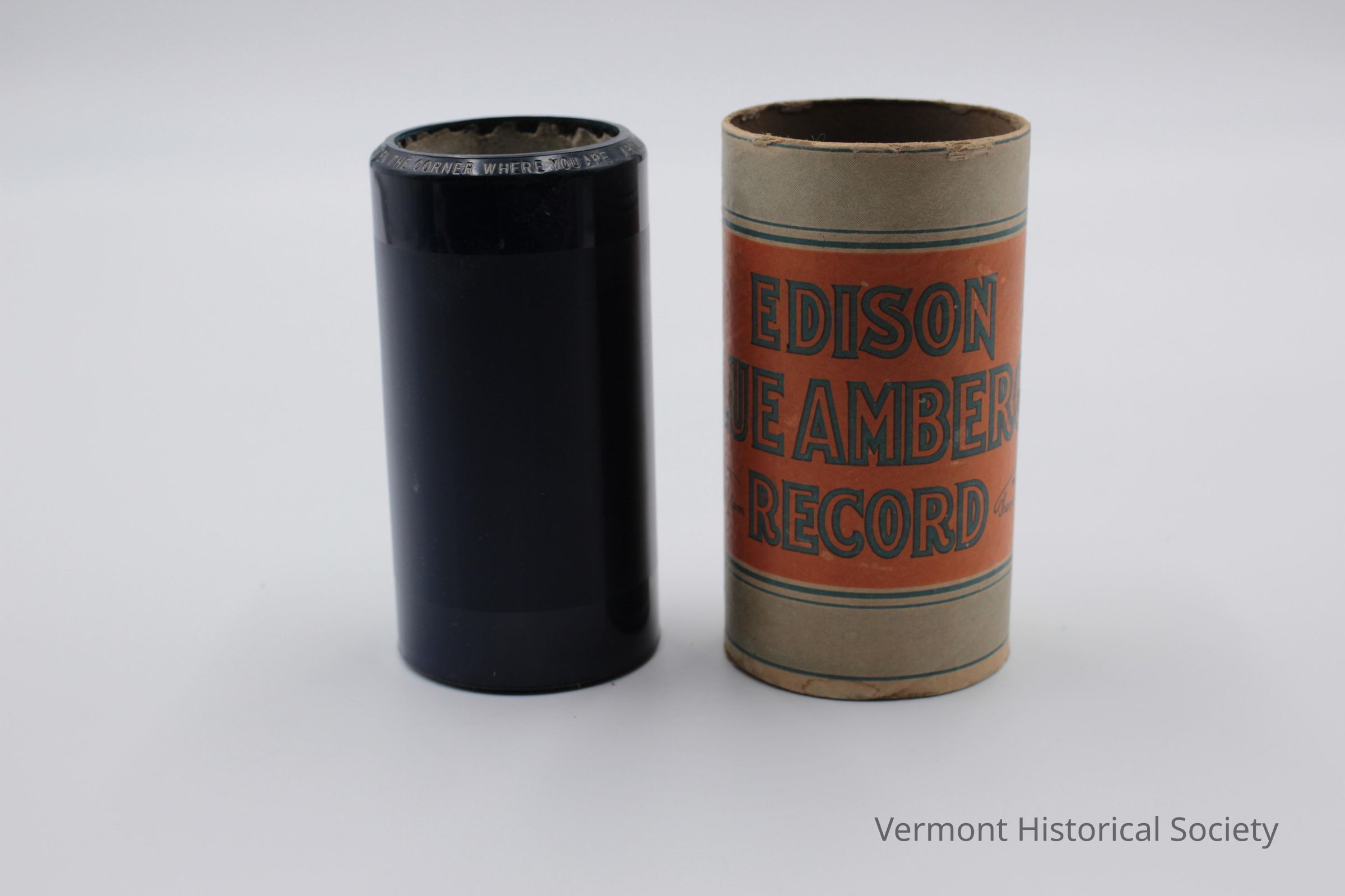 The cylinder is accompanied by a cardboard case.. The case is labeled on one side with the words, "EDISON BLUE AMBEROL RECORD", in blue on an orange ground. The other side is printed with a photographic portrait of Thomas Edison above the patent and trademark information and the price (60 cents).Use