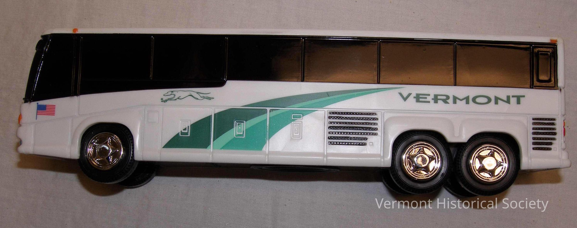 A bank in the shape of a "Vermont (transit)" bus. The bus is white with a three color green roadway on each side and a fully sprinting greyhound dog. "VERMONT" in dark green is toward the back of the bus. A U.S. flag is at the very front below the drivers window and on the door. "MADE IN CHINA" on the bottom just in front of the round porthole opening allowing owner to retrieve their money.