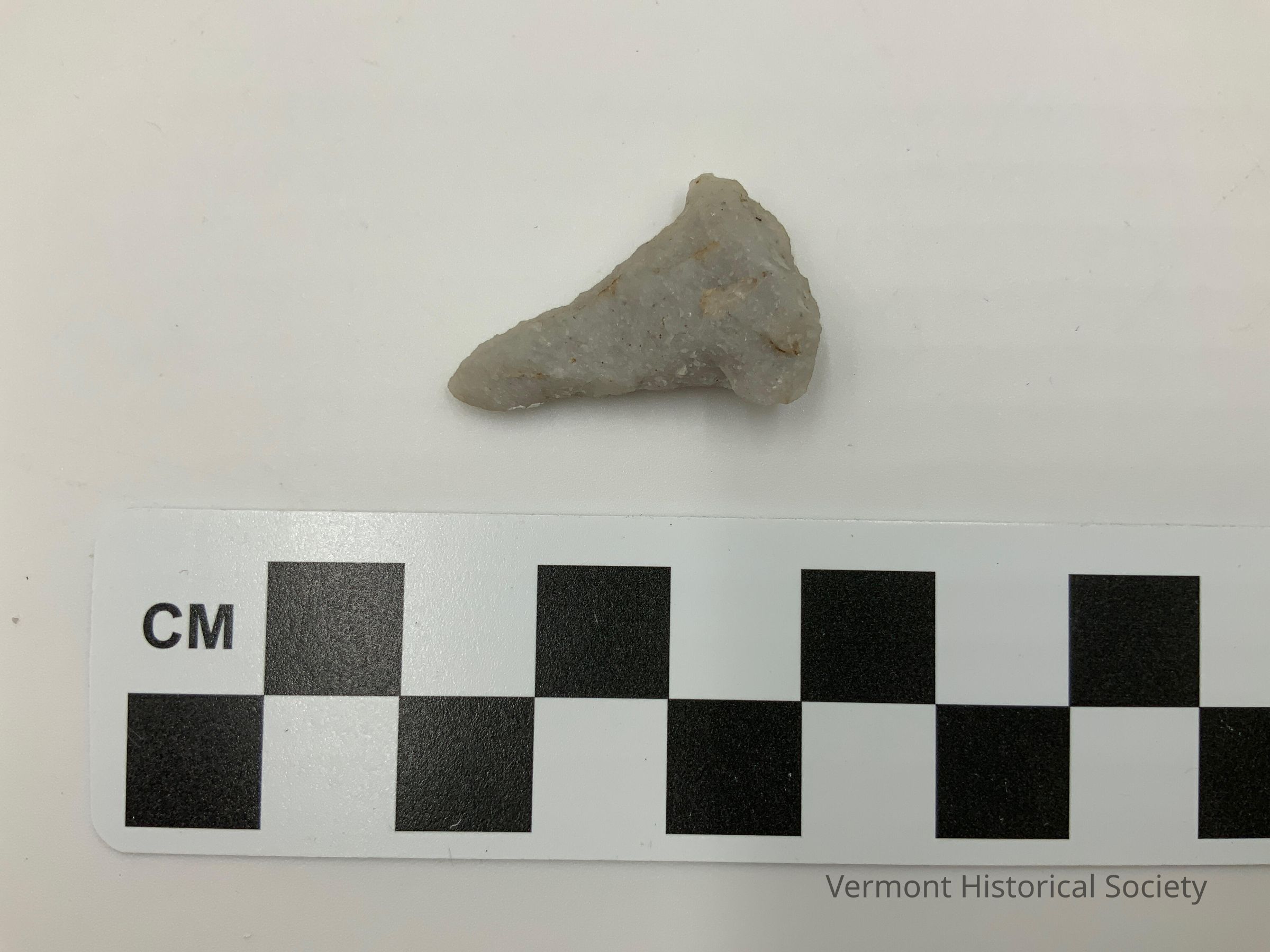 Chipped stone drill made of quartzite. The base is wide, and the drill is symmetrical with straight blade edges.Context