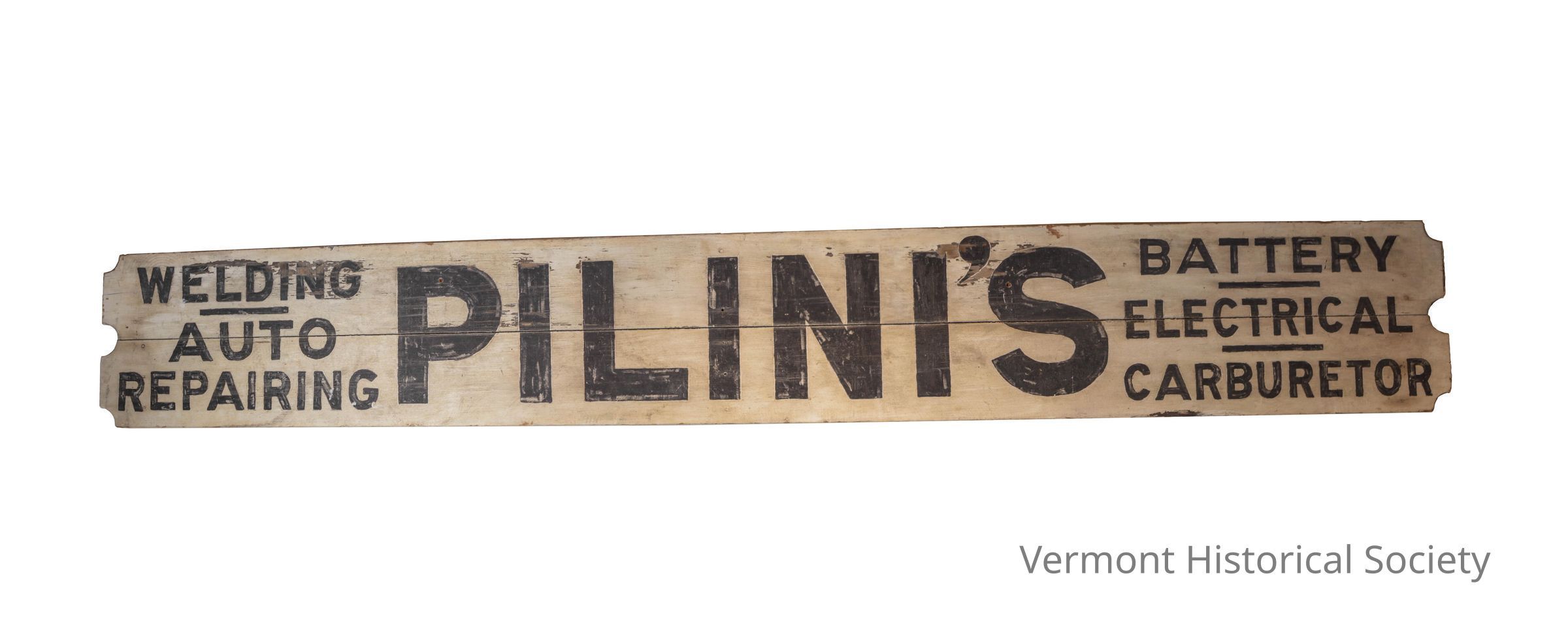 Trade Sign, ca. 1940 Montpelier, Vermont Wood, paint Museum purchase, 2008.18 James Pilini emigrated from Switzerland to Montpelier in the late 1920's. After marrying Gloria Miller of Montpelier and starting a family, he opened his garage at 19 Pitkin Court behind the Fire Station. The garage operated into the 1970's. This painted wood sign probably dates from the 1940s.