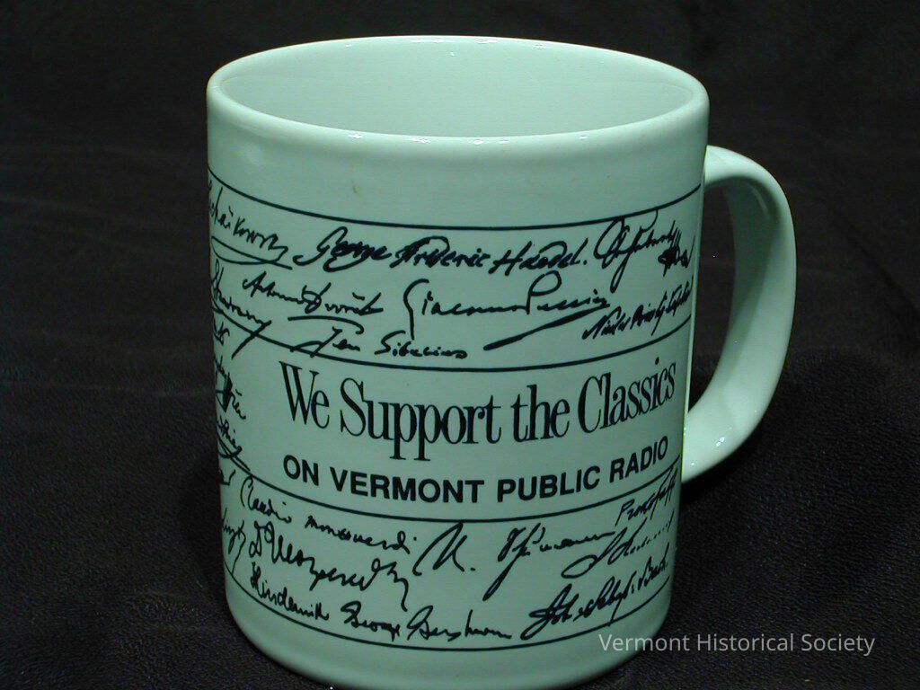 White mug with navy blue signatures of classical music composers. Across the middle is the inscription, "We Support the Classics ON VERMONT PUBLIC RADIO."