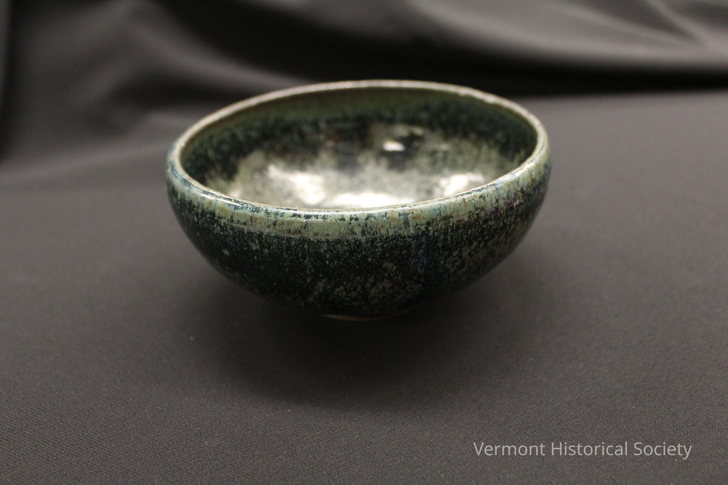 Small ceramic bowl with curved in rim. The bowl is glazed with a mottled decorative glaze in brown, green, and turquoise. The bottom is marked, "SCATCHARD STONEWARE".Context