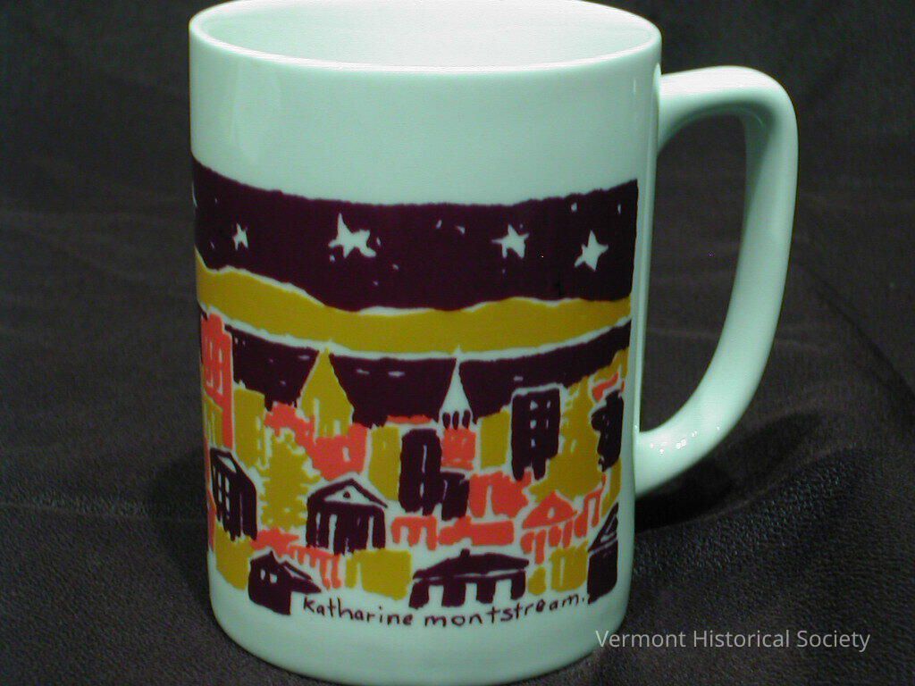 White ceramic coffee mug printed with the skyline of Burlington, Vermont, at night. The artistic image is in purple, yellow, and orange and signed Katharine Montstream. The bottom is labeled, "Designed for VPR".Context
