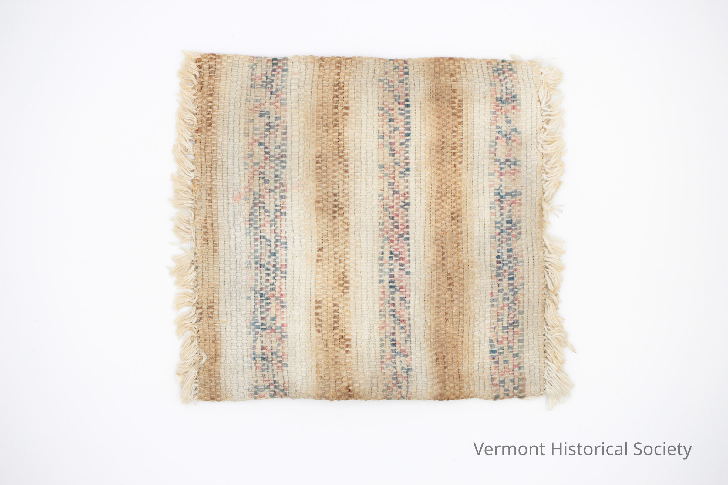 Miniature rag rug sized for a dollhouse. The rug is woven with fabric strips as the weft and cotton yarn as the warp. It is arranged in stripes: white, multi-colored, white, brown. There is warp fringe on two sides.Context
