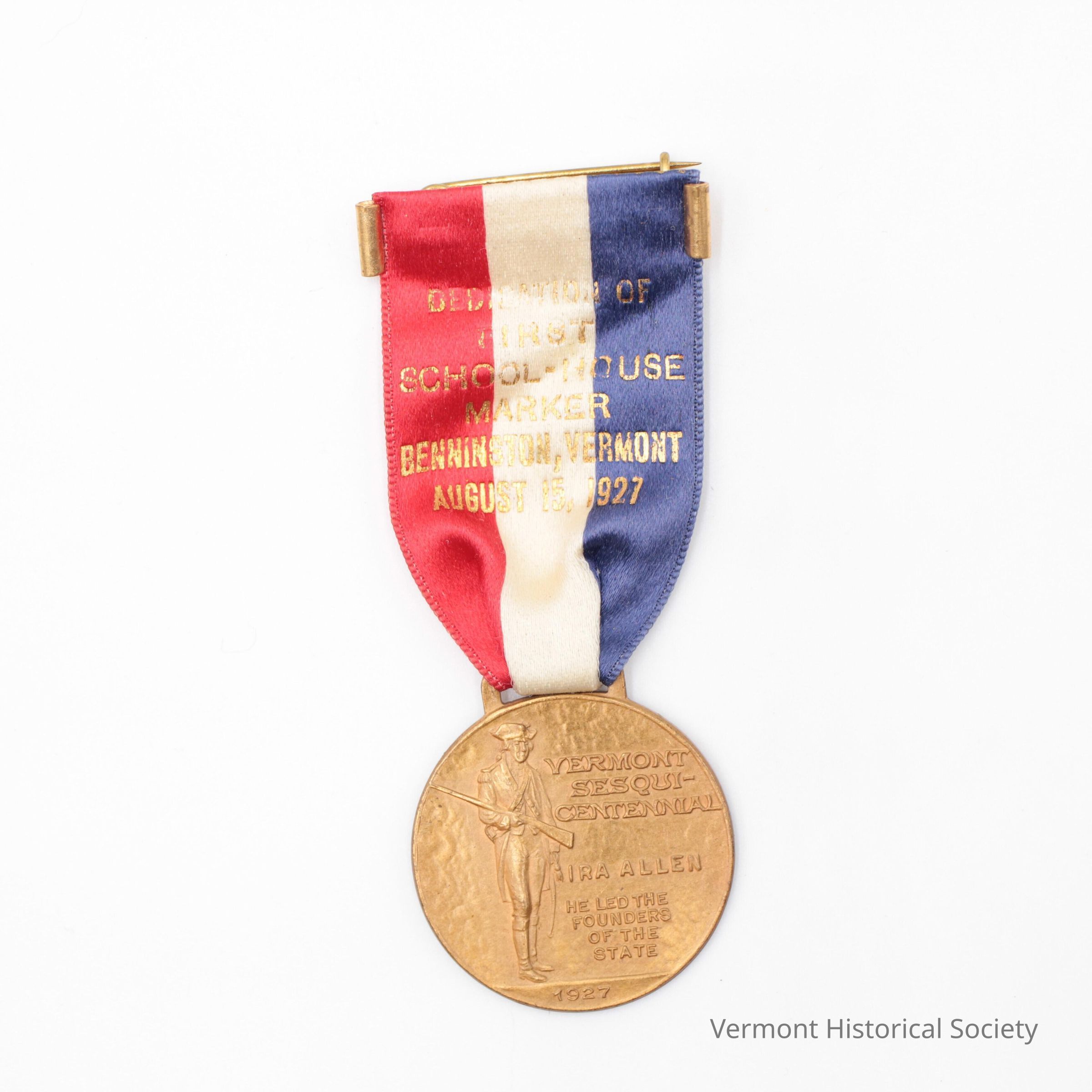 Round, gold medal hanging from a red-white-and-blue striped ribbon. The top of the ribbon is attached to a spring-backed pin. The ribbon is printed in gold with the inscription, "DEDICATION OF FIRST SCHOOL-HOUSE MARKER BENNINGTON, VERMONT AUGUST 15, 1927". The front of the medal is molded with an image of a Revolutionary War soldier slouching and holding a long gun in one arm. To his right is the inscription, "VERMONT SESQUICENTENNIAL / IRA ALLEN / HE LED THE FOUNDERS OF THE STATE / 1927". The back of the medal is marked, "THE WHITEHEAD & HOAG CO. NEWARK, N.J." The medal is held onto the ribbon with a metal crimp.Context