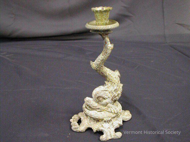 Lead candlestick in the shape of a dolphin. The dolphin is of the early, artistic type with a monstrous head and a snake-like body. It is shown with its head laying on a rococo style four-legged round base and its body twisting upward to hold the brass candleholder cup at the top.