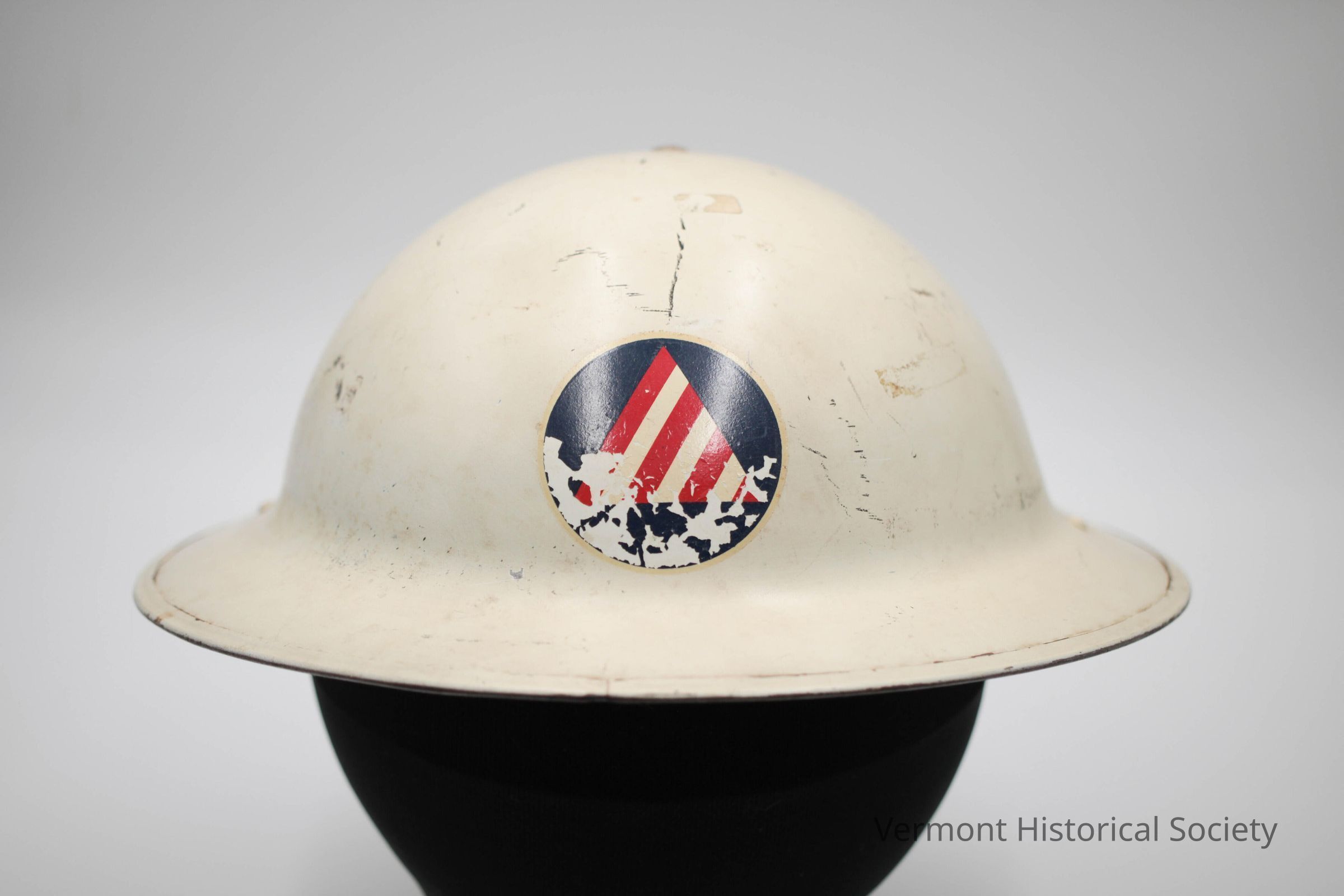 Round white helmet with the Civil Defense logo at the center front. The logo consists of a blue circle with a red-and-white striped triangle in the center. The interior is padded with a stuffed roll of black leather, the ends of which tie together with cotton tape. There is a grey, woven tape chin strap attached to metal brackets on either side.