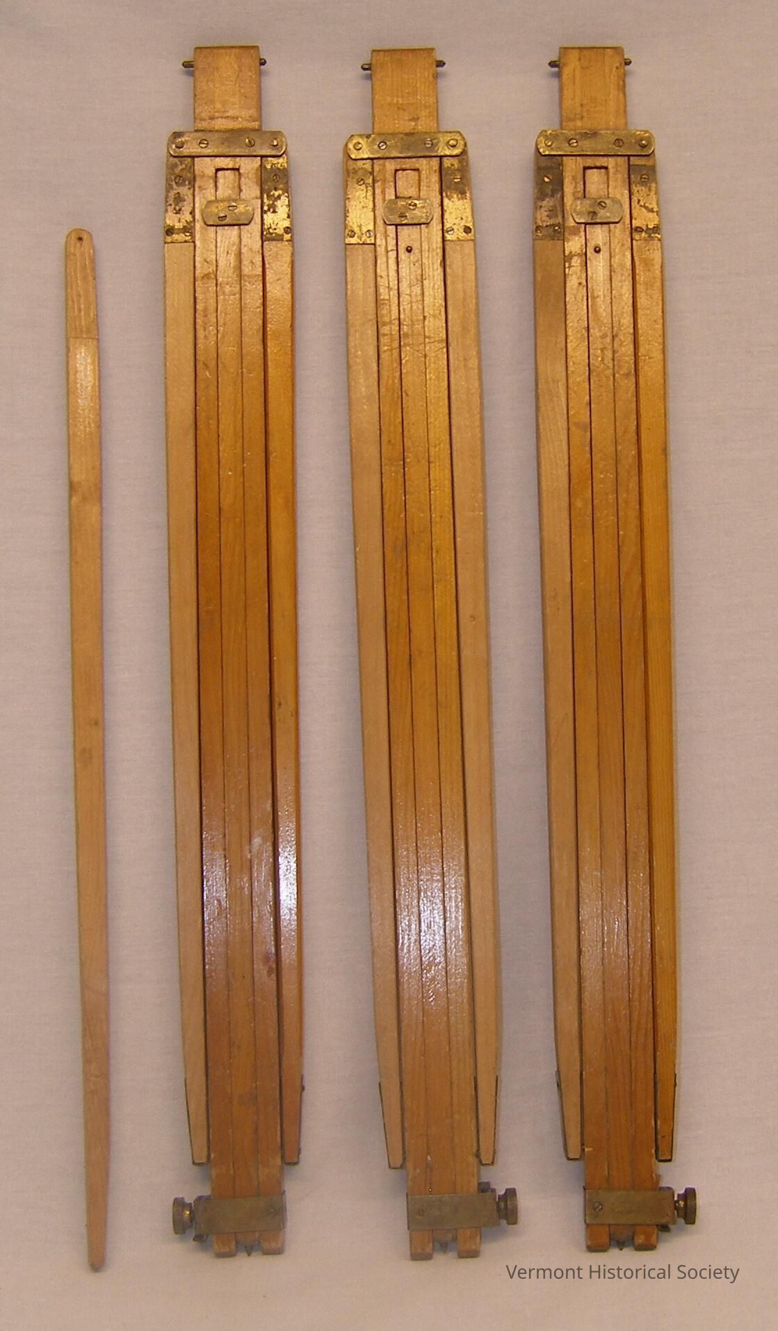 This sliding wood tripod consists of three separate pieces with brass fittings, and there is also a separate wood connection piece with metal fittings and a felt top. The bottom section of the legs features sharp brass points. There are no markings indicating the manufacturer. An extra tapered rod is included. Additionally, there is a miscellaneous piece of silver metal disc and fitted brass screw with a large concave head. These items were found in the camera box, but their function is unknown.