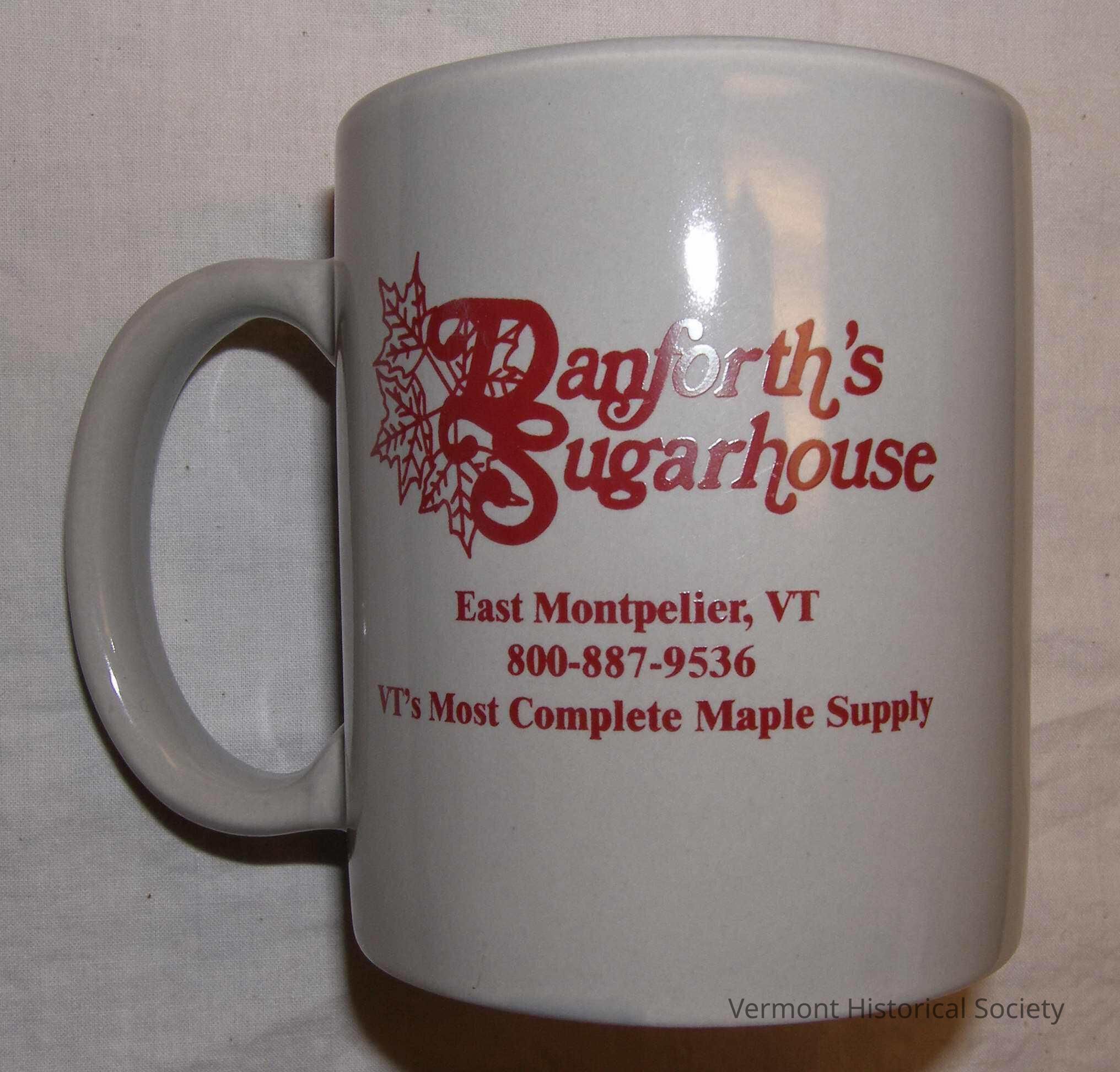 White coffee mug. Red printed text reads "Danforth's / Sugarhouse / East Montpelier, VT / 800-887-9536/ VT's Most Complete Maple Supply" on one side and "Danforth's Sugarhouse / Home of Free Shipping / and Cash 'n Carry Prices" on the other. There are four maple leaves to the left of the Danforth Sugarhouse logo.