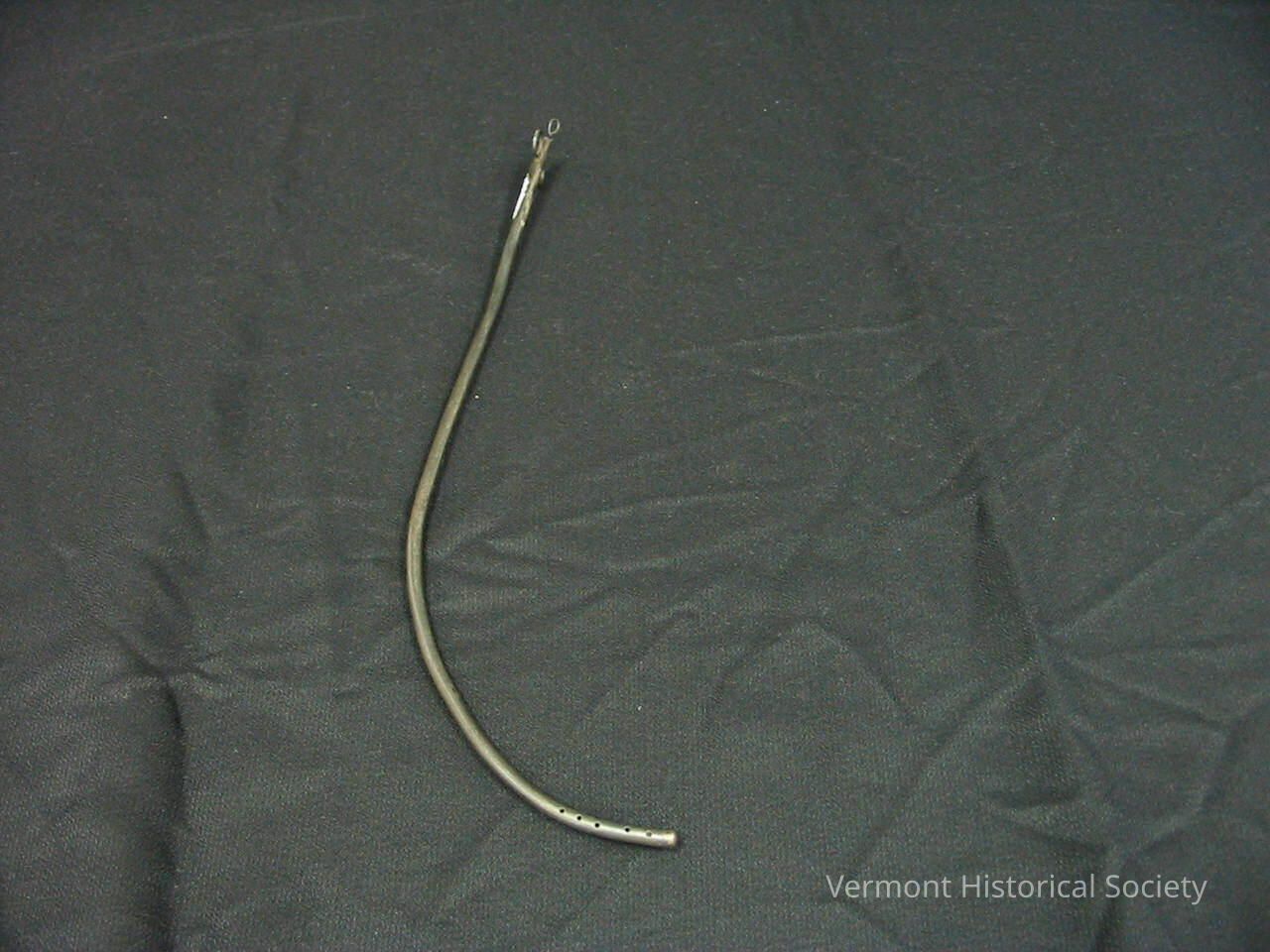 Long metal tube. Half the tube is straight, and the other half of the tube curves until the end is perpendicular to the first half. The straight end has a wire loop, likely for hanging. The curved end has five holes drilled into it.