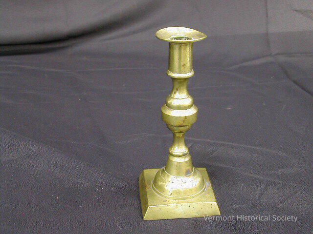 Brass candlestick with a square base. The bottom of the shaft is shaped like a bell, and the rest of the shaft is shaped like a baluster.