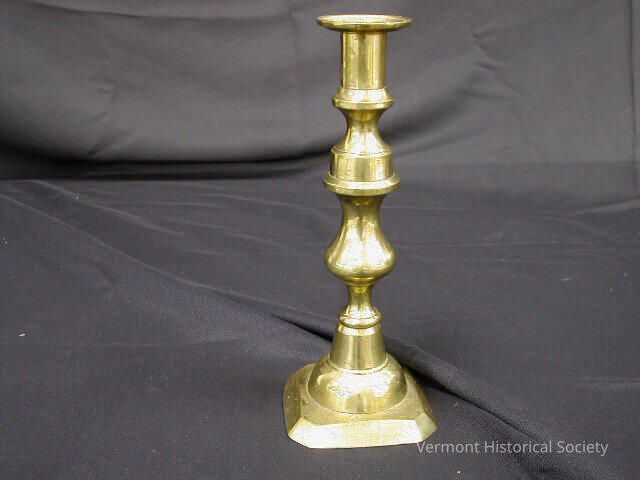 Tall brass candlestick with a square base with chamfered corners. The shaft is decoratively turned with architectural molding shapes.