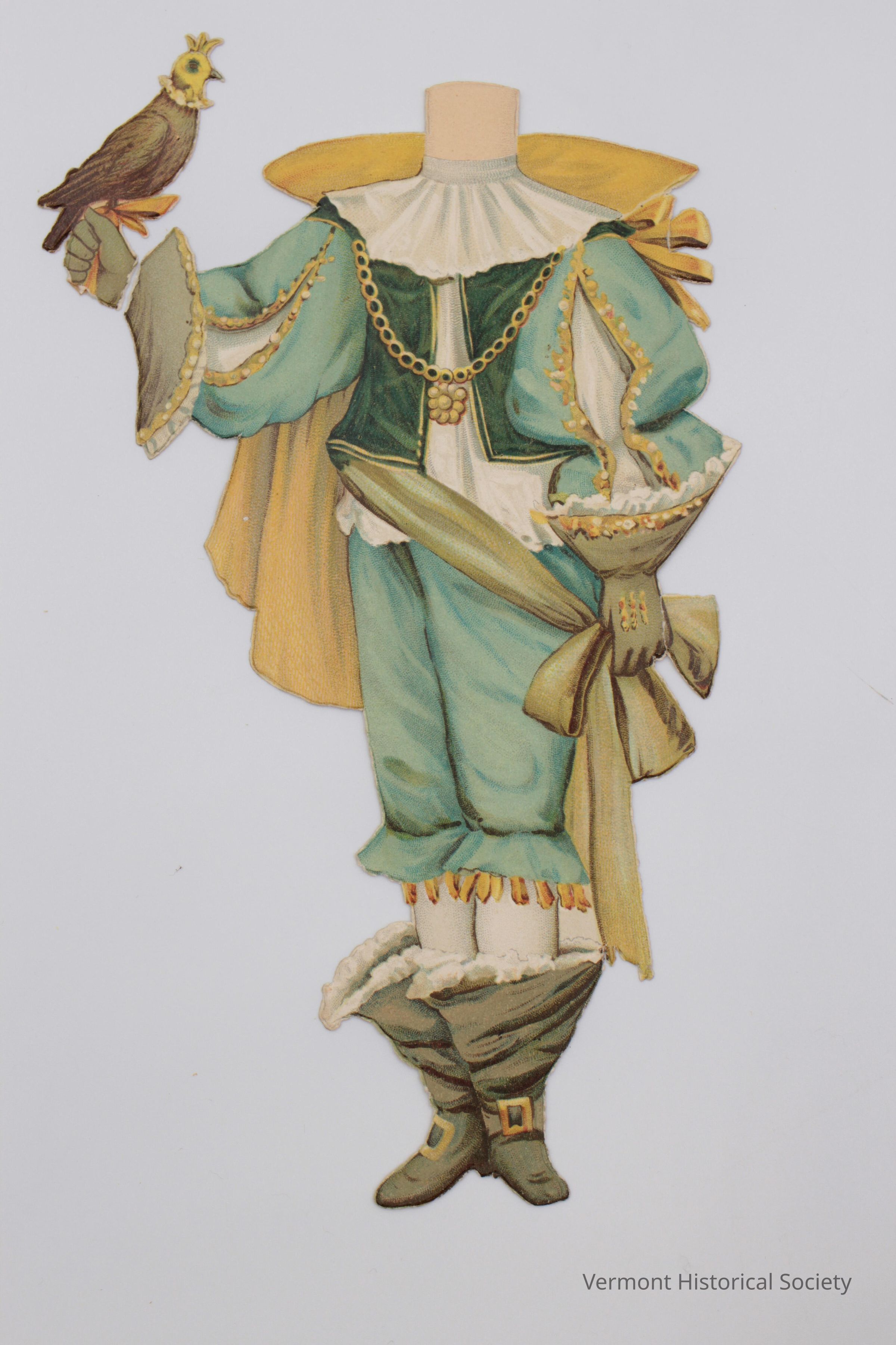 Stylized 17th-century costume for a paper doll. It consists of a short green jacket with wide, slit sleeves over a white shirt with a ruffled collar, green knee-length breeches, a yellow cape, green gloves, and green boots. There is a green ribbon crossing the hip diagonally. The gloves are gauntlet style and trimmed with lace and gold. The hem of the breeches are ruffled with gold fringe or beads. The boots are buckled, and the uppers flare outward dramatically. The cape has a broad standing collar. The right hand is holding a bird (detached).Context