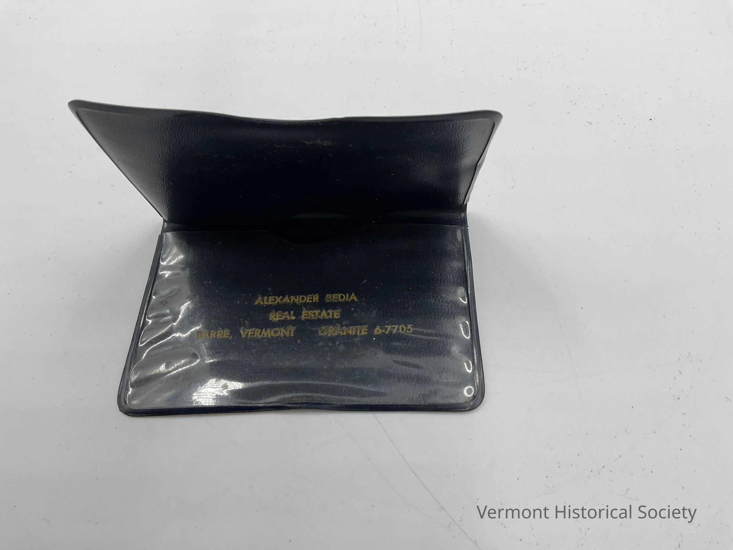 A black plastic case for carrying business cards. The case has a clear plastic pouch and a flap. Printed in gold on the clear plastic is the following: Alexander Bedia, Real Estate, Barre, Vermont, Granite 6-7705.Context