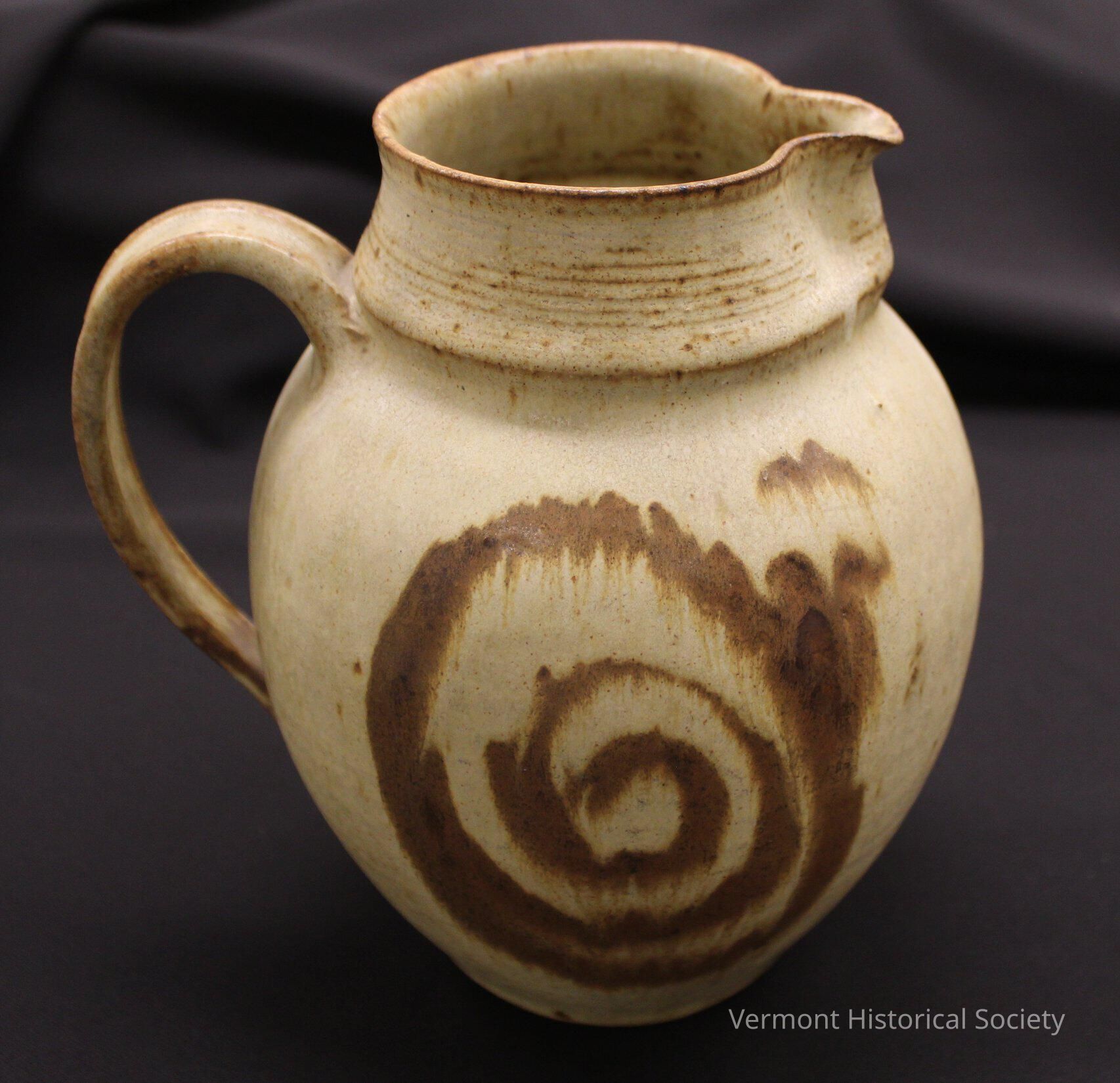 Ceramic pitcher glazed in light brown with a dark brown swirl on either side of the body. The pitcher has a protruding shoulder before narrowing at the top. The bottom is marked, "Jean Paul Stowe VT".