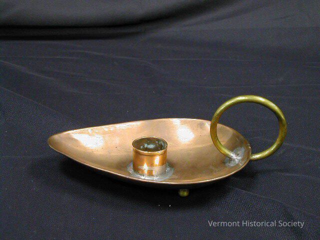 Chamberstick with a leaf-shaped or early-oil-lamp-shaped copper base. The candleholder sits at the center of the base, attached with noticeable solder. A brass ring is soldered to the center back of the base as a handle.