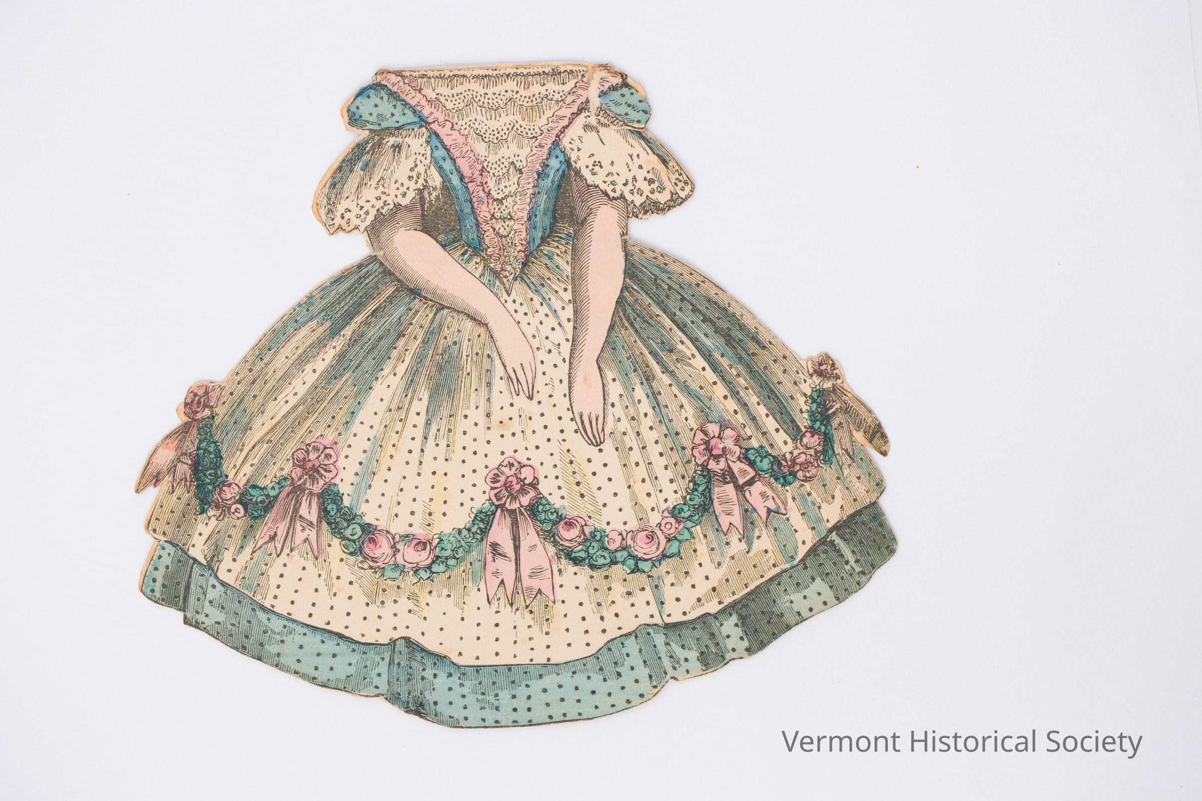 2-sided paper doll dress showing a blue-and-white dress with a voluminous skirt. The dress sits off the shoulders, and there is a swag of pink roses around the skirt.Context