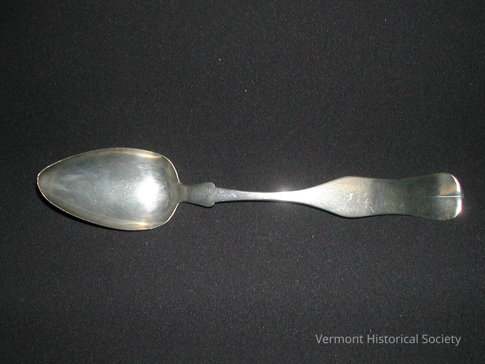 Large silver spoon with the mark "BRINSMAID'S". There is an eagle on either side of the mark. An engraved, cursive letter "B" is located on the back side of the handle.