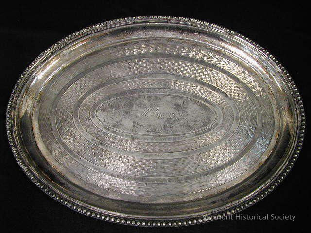 Oval silver tray with a chased design of concentric bands of basket weave and chevrons.Context