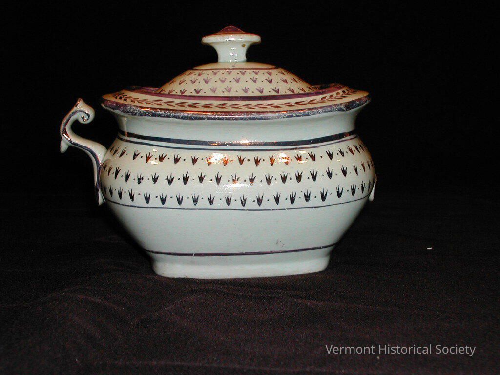 White ceramic sugar bowl decorated with pink luster sprigs. The squat, vasiform bowl has scrolling handles on either side (one now missing). The rim of the opening flares outward and is decorated with a pink luster floral vine. The lid is sprigged in the same design as the body and topped with a rectangular handle.