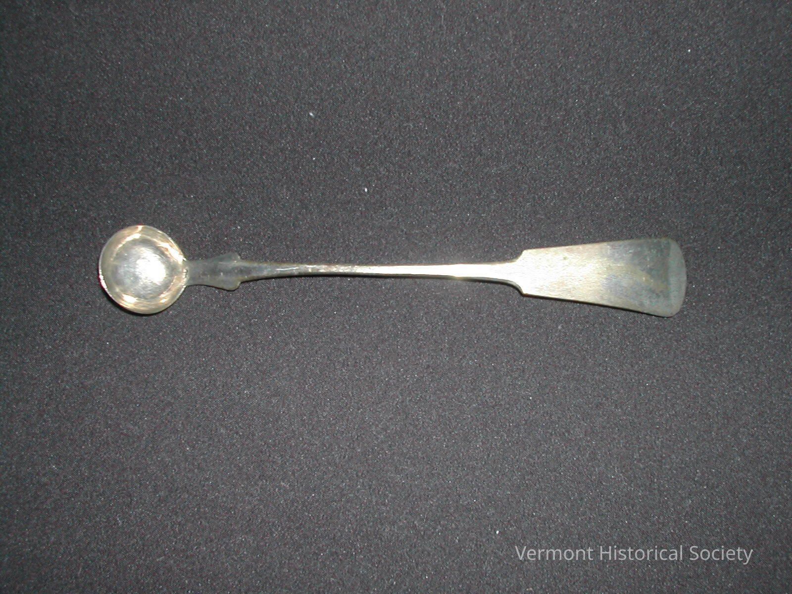 Long-handled mustard spoon with a circular bowl. The back is marked, "BRINSMAID'S", "B", "D", and an animal icon. The handle is not engraved.