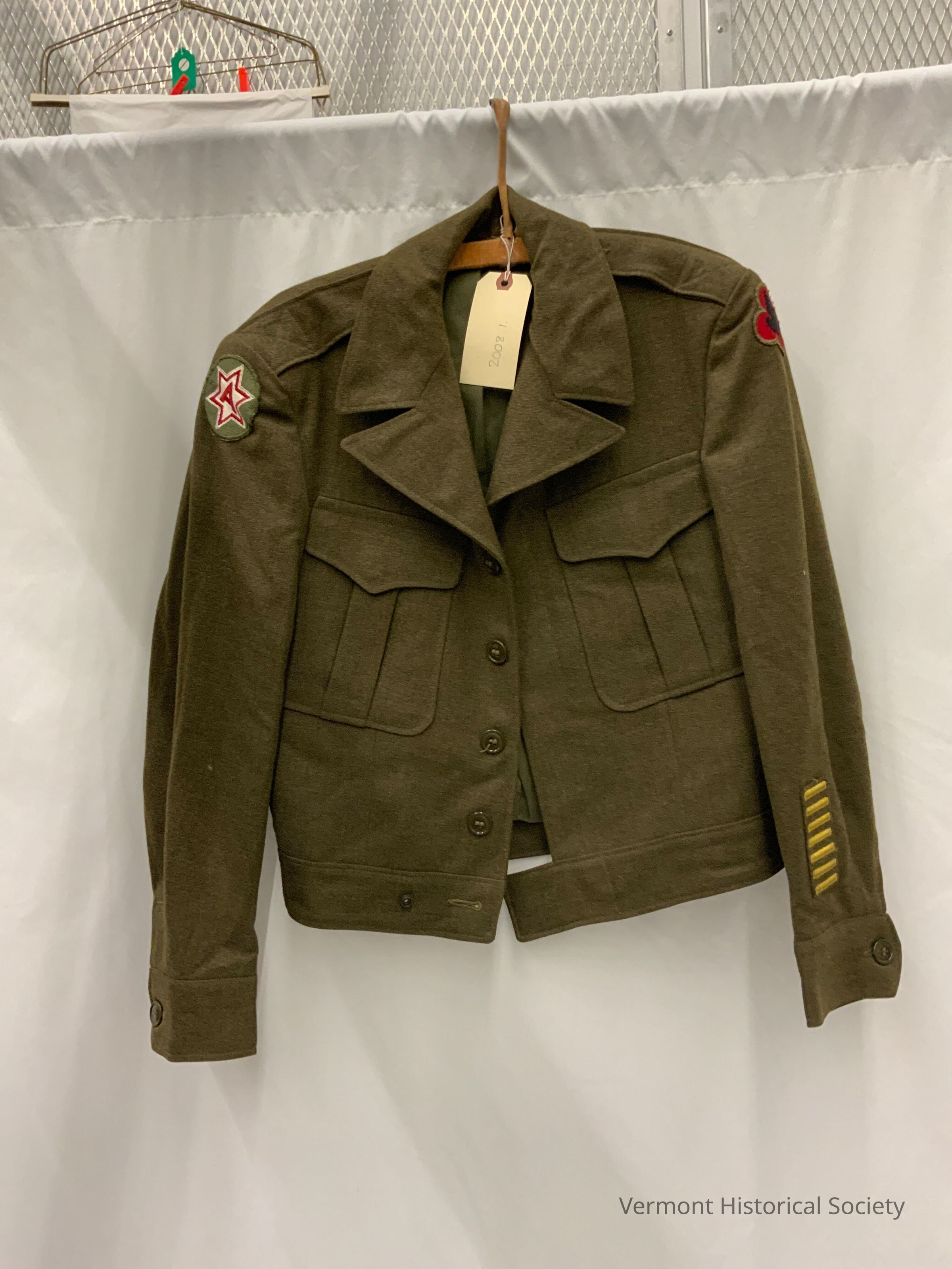 This jacket was worn by Lawrence Rossi (1918-2025) of Barre during military service. He spent three years in the Pacific Theater during WWII, serving as a 1st Lieutenant with the Army's 172nd Infantry. After he was discharged in 1946 he continued to serve in the Vermont National Guard and was reactivated to serve in the Korean War. He retired as a Major from the Vermont National Guard in 1963.Acquisition