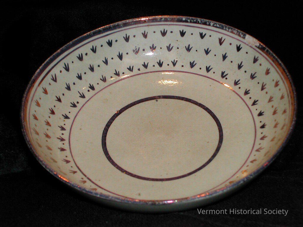 White ceramic saucer decorated with bands and sprigs of pink luster.