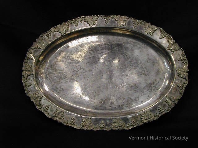 Oval silverplate tray with a raise rim decorated with relief molded grapes.Context
