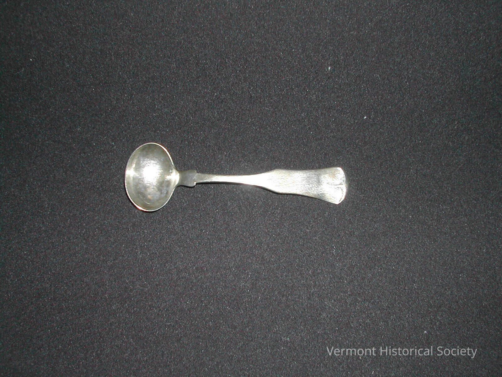 Short-handled mustard spoon with an oval bowl. The back is marked, "BRINSMAI'S". The reverse of the handle is engraved with a cursive letter B.