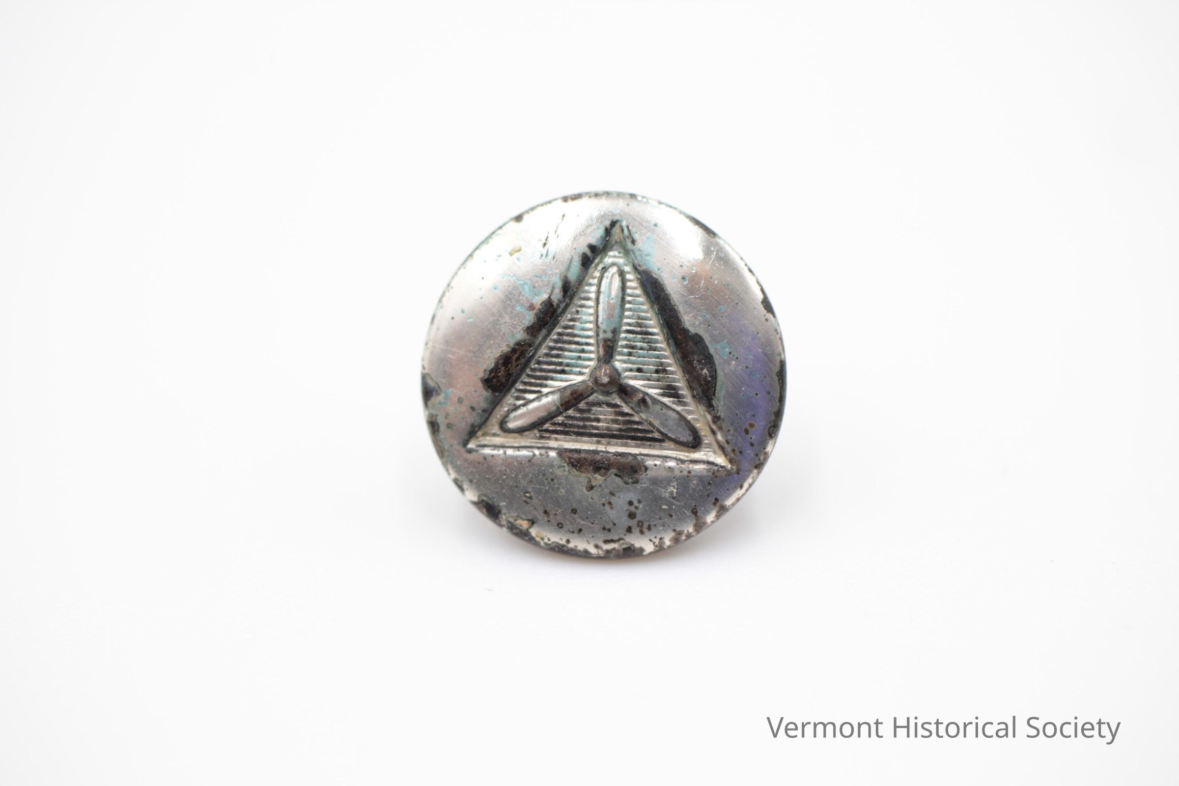 Silver-colored, metal button featuring the symbol of the Civil Air Patrol -- a triangle with a propeller in the middle.