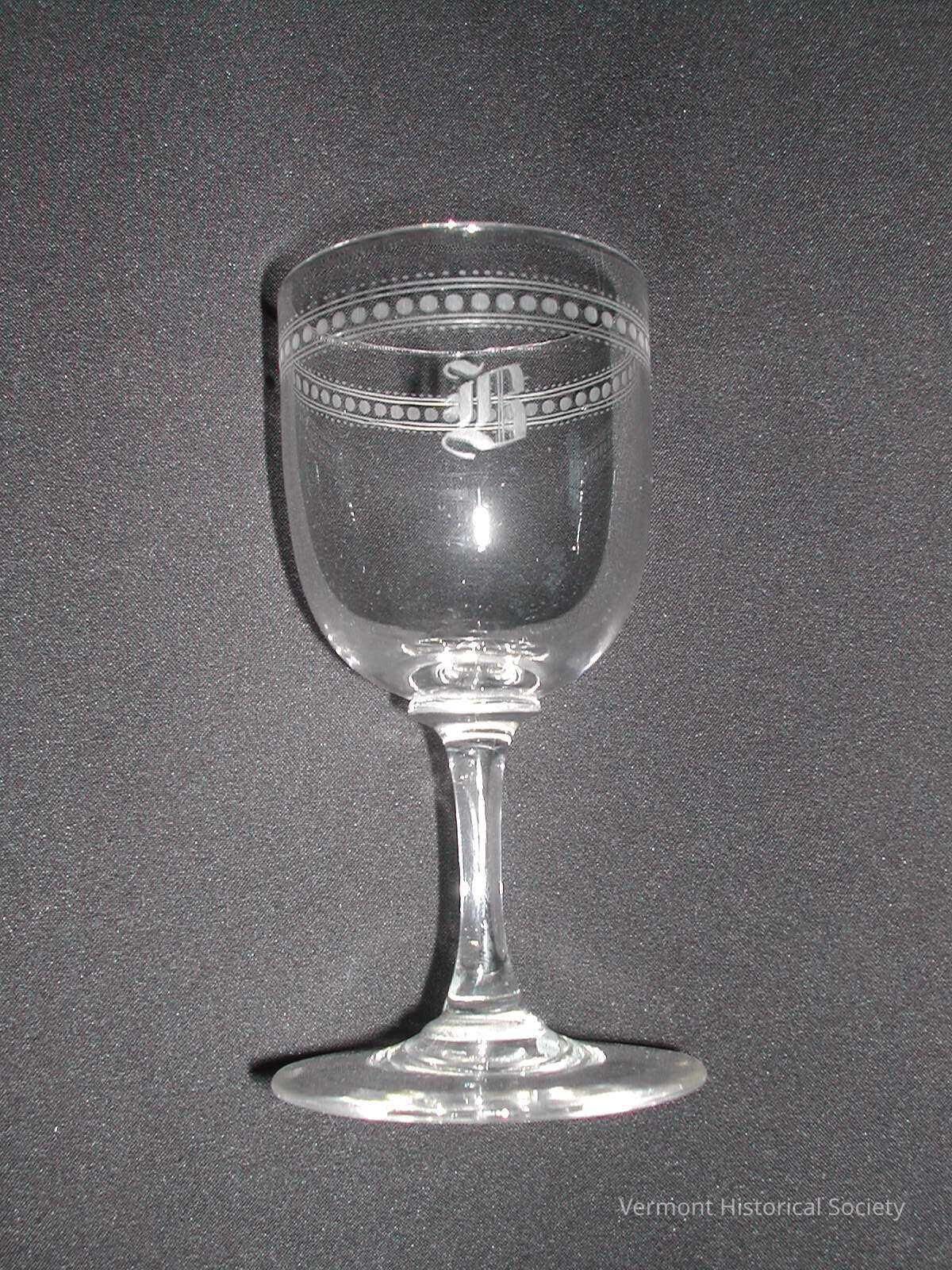 Small stemmed glass etched with the letter B in gothic font. There is an etched decorative border around the rim consisting of dots with a straight border.