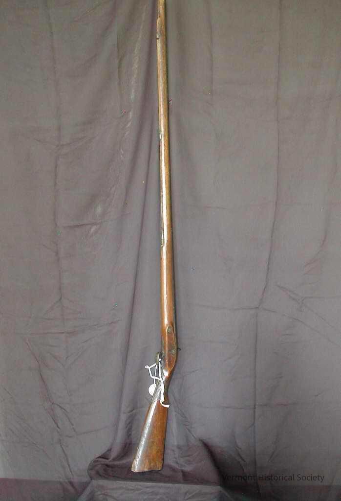 Long-barreled musket. It has a brass trigger guard and butt mount. The barrel is marked "ELG" within an oval, with a five-pointed star.
