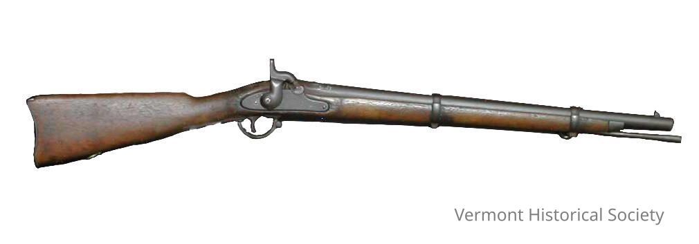 Rifled musket with a long barrel. The musket fires with a percussion cap above the trigger on the right side of the gun, and the gun is muzzle-loaded with a tamp stored in the wooden mount beneath the barrel. The lock plate is stamped, "U.S. L.G-&Y Windsor - VT", in front of the hammer and "1864" behind the hammer. The gun is a pattern 1861 Springfield Rifled Musket.Context