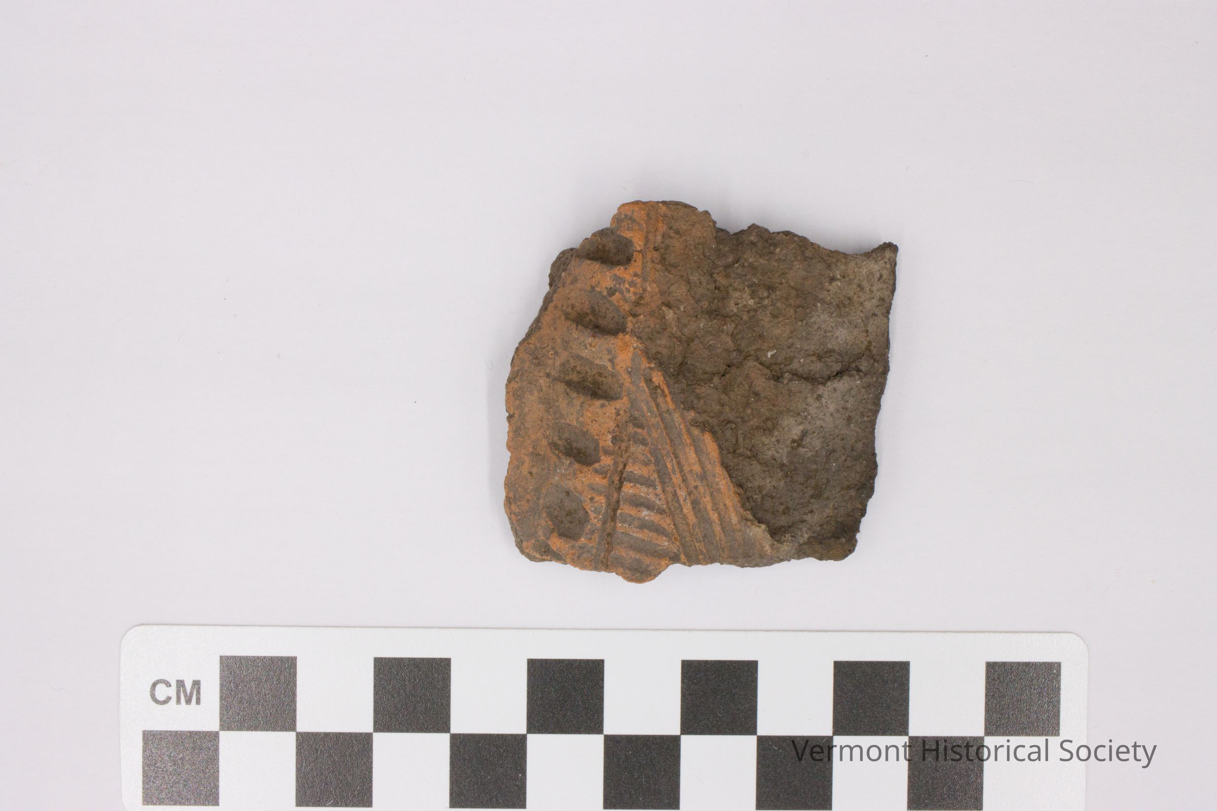 Shoulder sherd decorated with incised lines in a chevron pattern on the neck area.