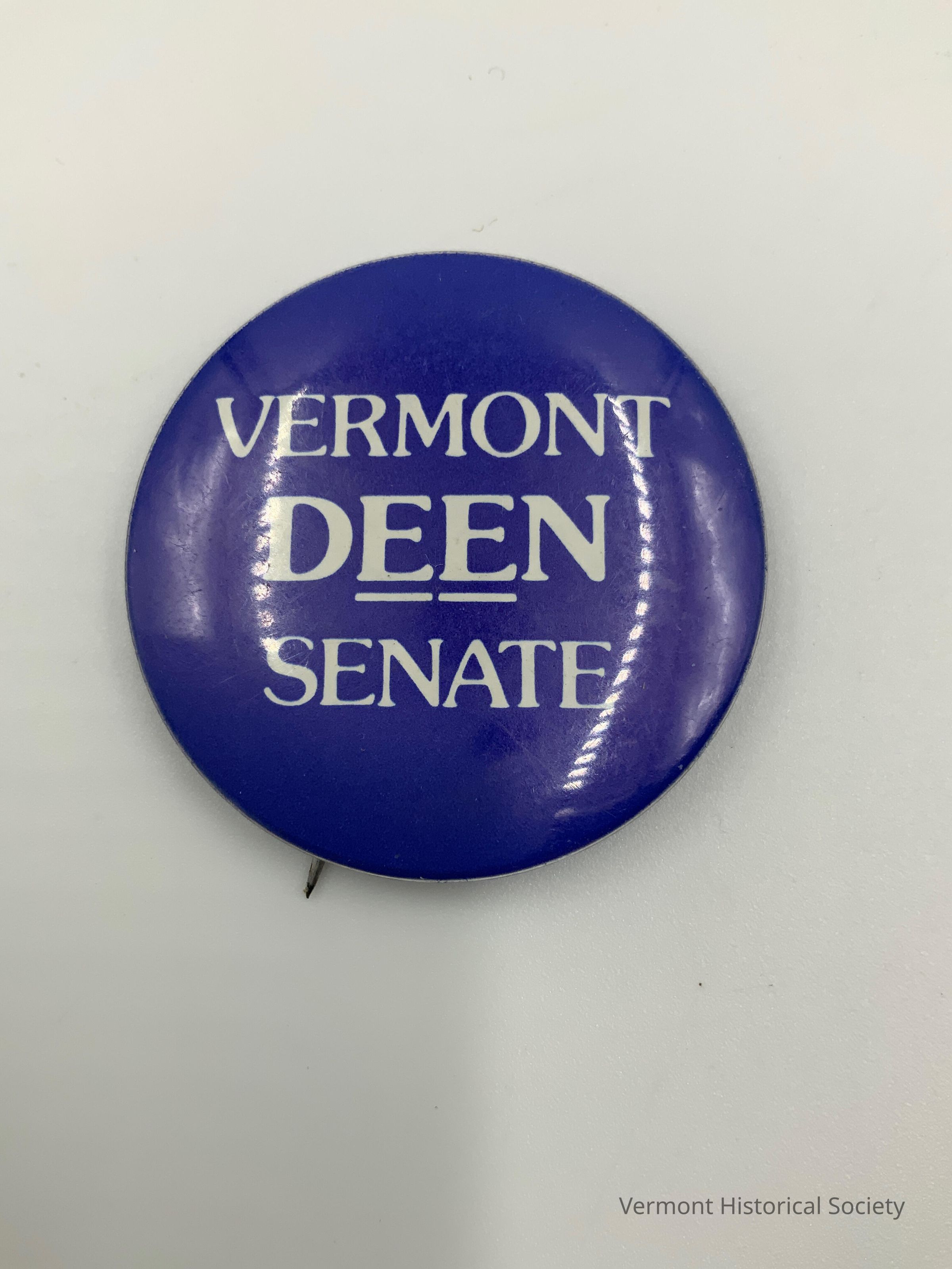 Round blue button with the white inscription, "VERMONT DEEN SENATE".
