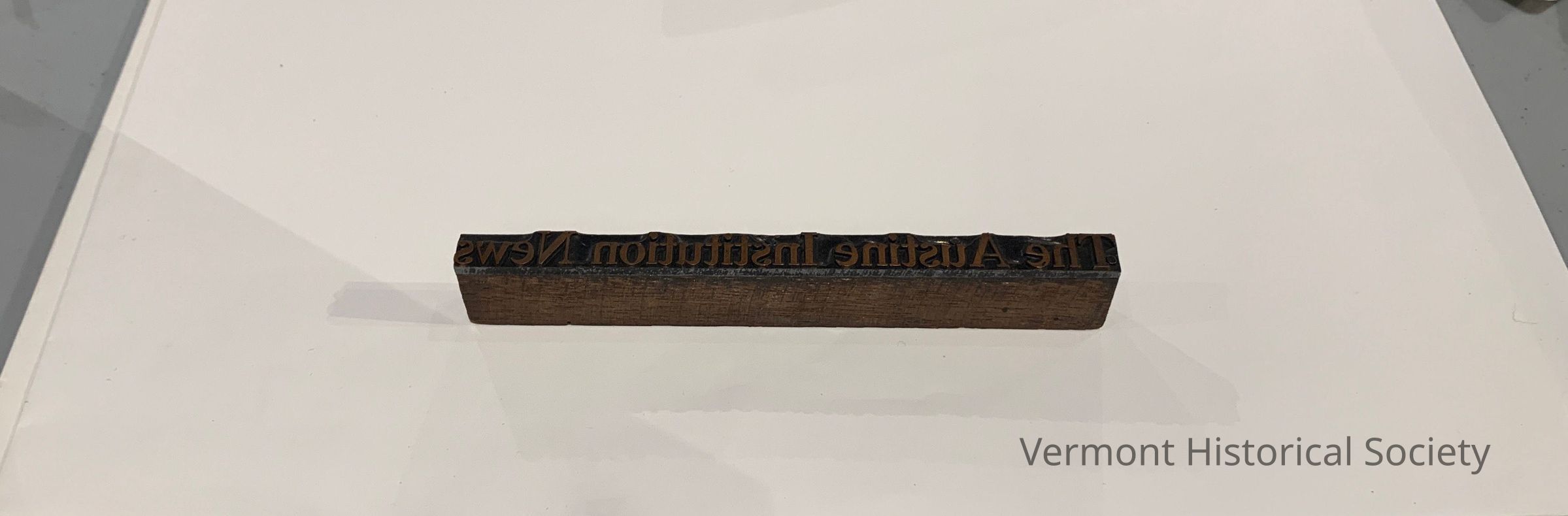 Thin, long printing block only containing inscription: "The Austine Institutional News" backwards. It has copperish sheen