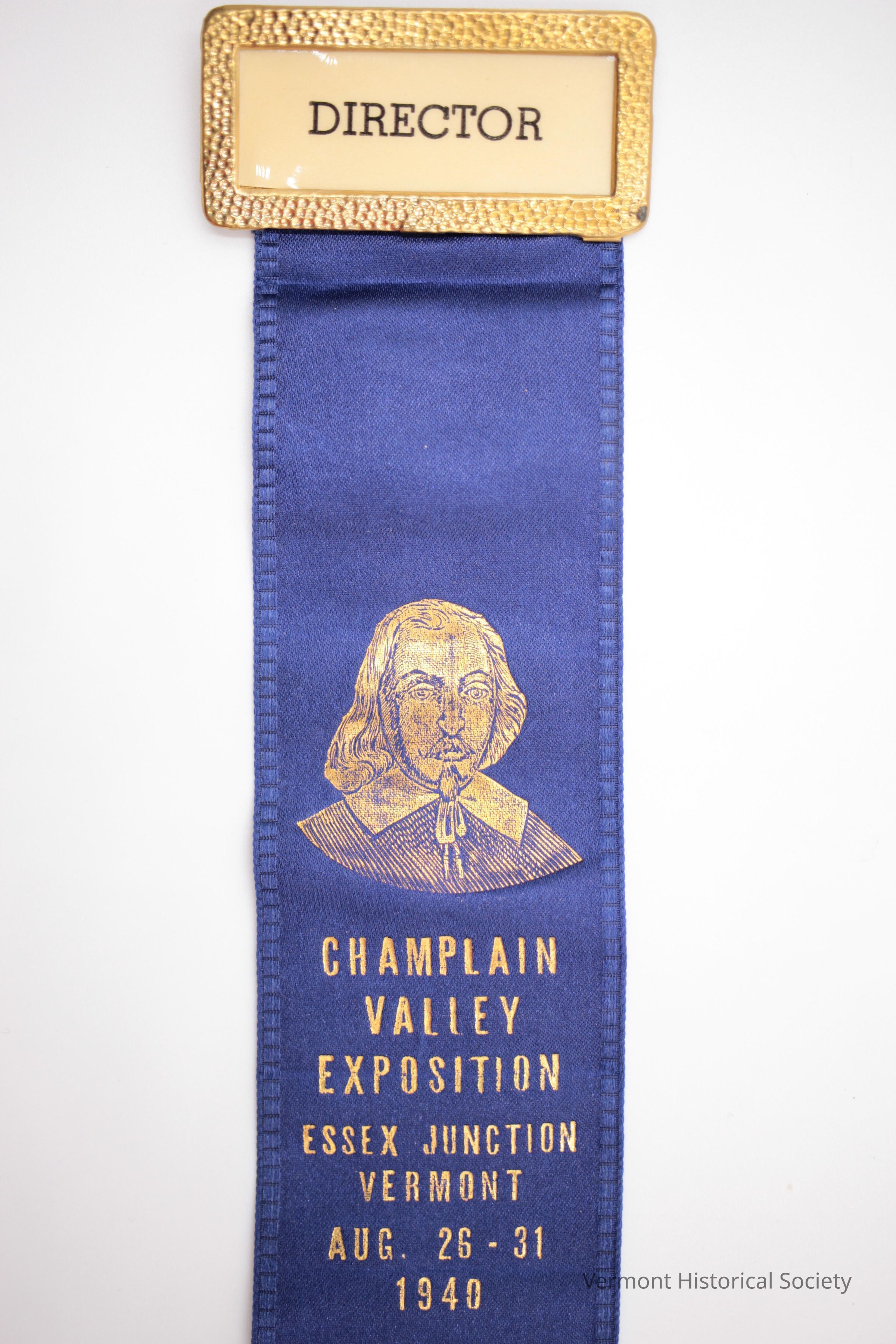 Blue ribbon printed in gold with an image of a man in 17th century clothing (Samuel de Champlain) and the inscription, "CHAMPLAIN VALLEY EXPOSITION ESSEX JUNCTION VERMONT AUG. 26 - 31 1940". The top of the ribbon is attached to a gold-framed name tag that reads, "DIRECTOR", and has a pin on the back.