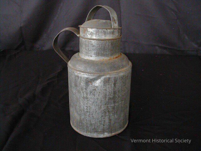 Cream can probably made in the tin factory in East Calais, VT. Straight sided (for 5 3/8") curving inward to form a neck. Side handle. Lid has a loop handle and domed top.